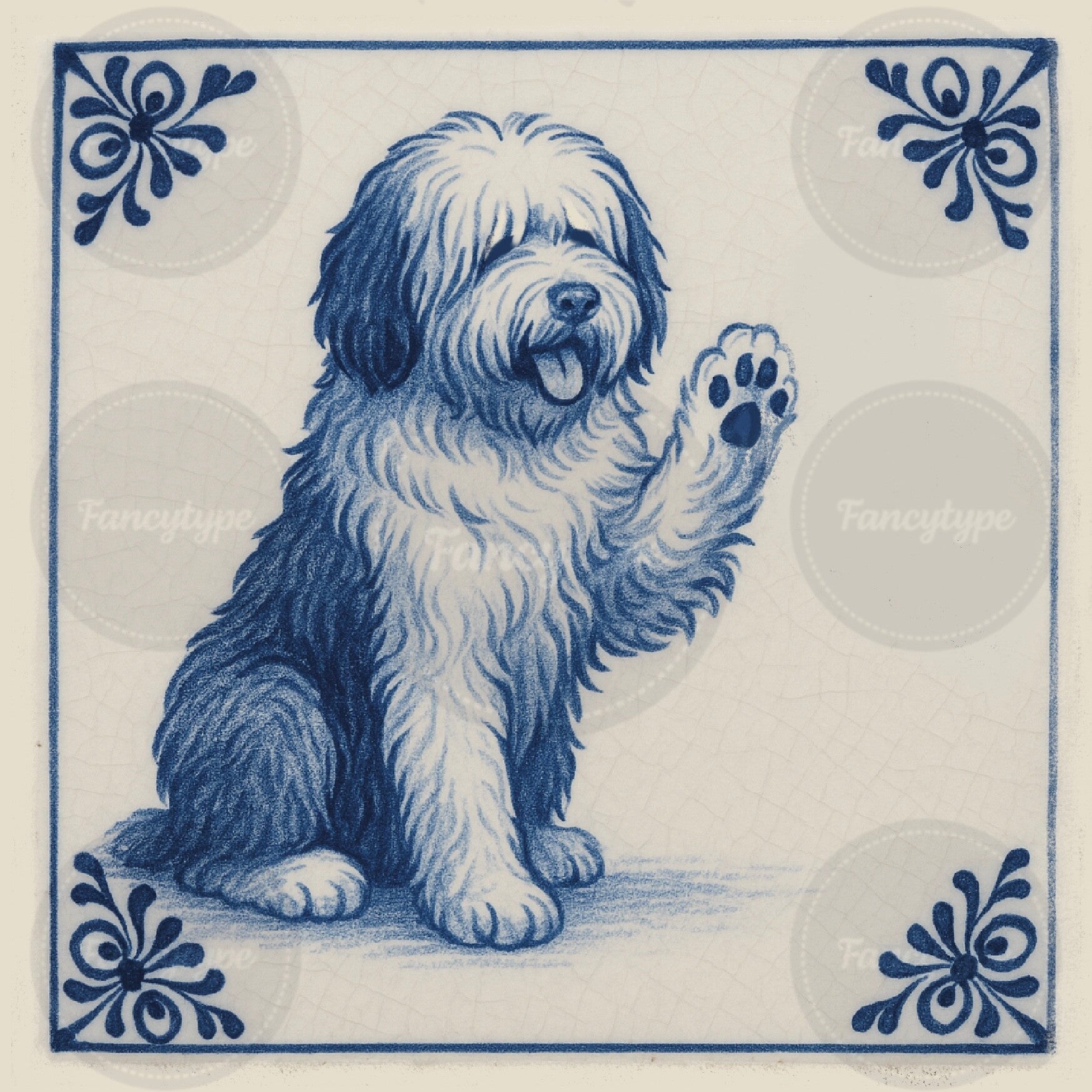 Op deze kaart zie je een vrolijke Old English Sheepdog die enthousiast een High Five geeft. De opgeheven poot, de open, vriendelijke blik en het speelse karakter van de hond komen prachtig samen in de Delft Blauwe Tegeltjes stijl. Het klassieke blauw-witte lijnwerk geeft het gebaar een charmante, typisch Hollandse twist. Een kaart die direct energie en positiviteit uitstraalt — perfect om iemand aan te moedigen, te feliciteren of gewoon een glimlach te bezorgen.